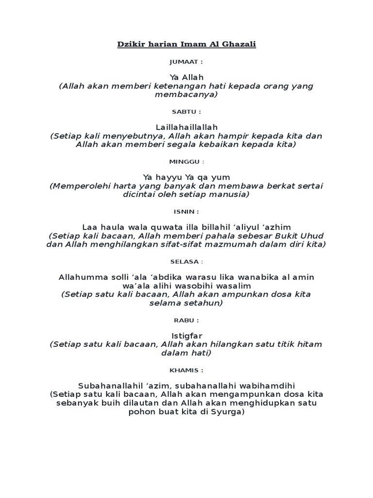 Zikir Harian Isnin Hingga Ahad Amalan Imam Al Ghazali Aliff Co Al Ghazali